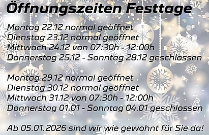 Nous sommes ouverts pendant les fêtes de fin d'année comme suitDE PLUS »