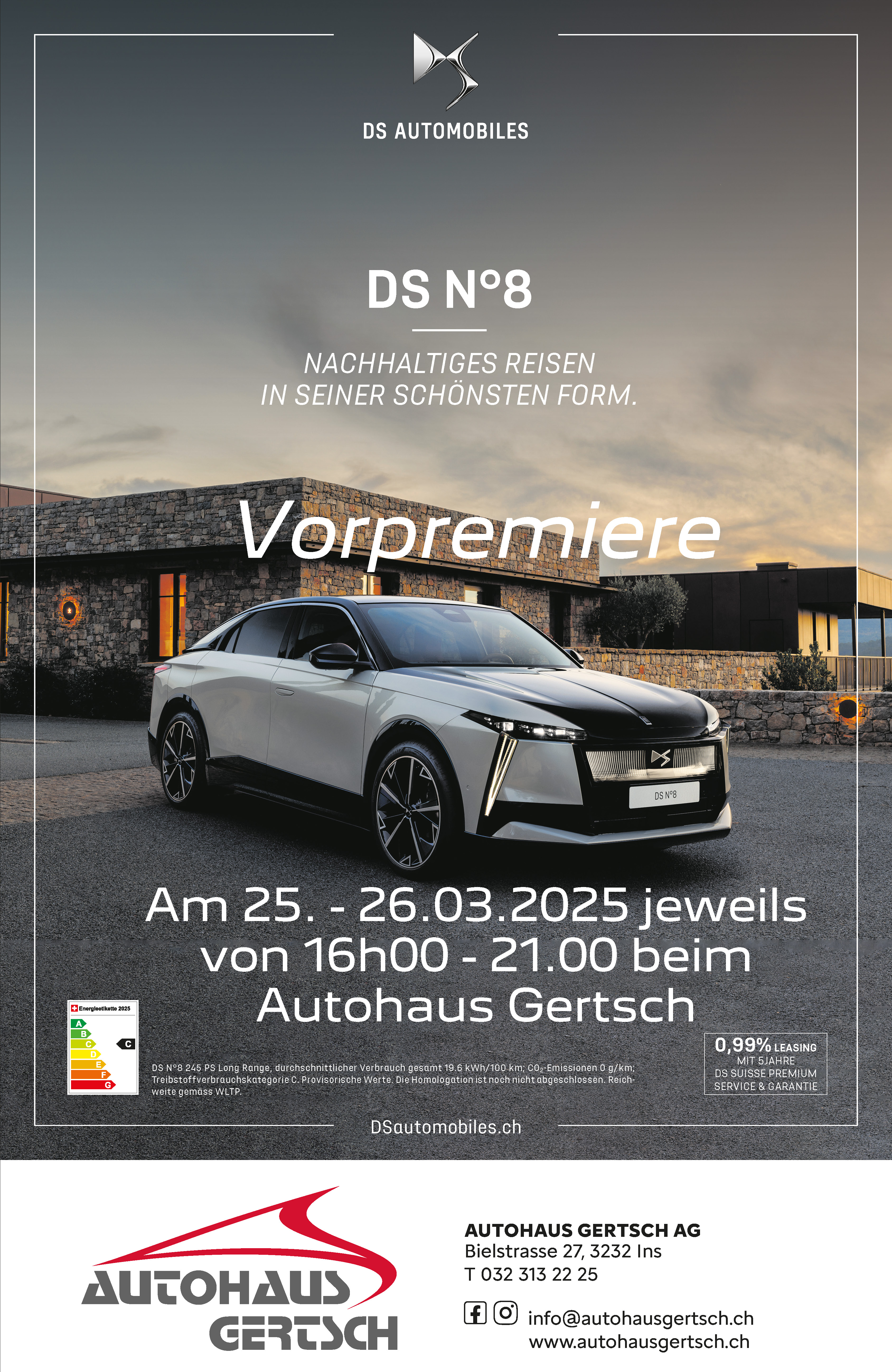 Nous vous souhaitons la bienvenue dans notre showroom le 25.03.25 - 26.03.25 à partir de 16h00 pour la présentation en avant-première de la nouvelle DS N° 8.